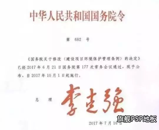 《國(guó)務(wù)院關(guān)于修改〈建設(shè)項(xiàng)目環(huán)境保護(hù)管理?xiàng)l例〉的決定》已經(jīng)2017年6月21日國(guó)務(wù)院第177次常務(wù)會(huì)議通過,現(xiàn)予公布,自2017年10月1日起施行。