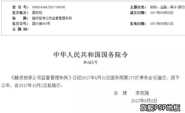為了規(guī)范融資擔(dān)保公司的行為,防范風(fēng)險(xiǎn),2017年8月2日,國(guó)務(wù)院總理李克強(qiáng)簽署國(guó)務(wù)院令683號(hào),公布《融資擔(dān)保公司監(jiān)督管理?xiàng)l例》(以下簡(jiǎn)稱條例),自2017年10月1日起施行。