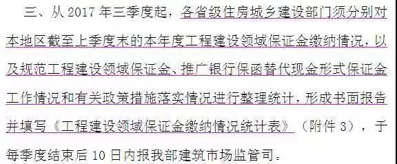 日前住建部發(fā)布建辦市函[2017]460號(hào)文,明確要求各省級(jí)住房城鄉(xiāng)建設(shè)部門須每季度要把推廣銀行保函替代現(xiàn)金形式保證金工作情況和有關(guān)政策措施落實(shí)情況進(jìn)行整理統(tǒng)計(jì),形成書面報(bào)告,進(jìn)行上報(bào),意思也很明確:各省要加快推廣銀行保函替代現(xiàn)金形式保證金。