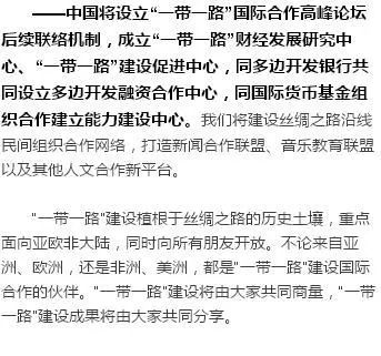 ——中國將加大對“一帶一路”建設(shè)資金支持,向絲路基金新增資金1000億元人民幣,鼓勵(lì)金融機(jī)構(gòu)開展人民幣海外基金業(yè)務(wù),規(guī)模預(yù)計(jì)約3000億元人民幣。中國國家開發(fā)銀行、進(jìn)出口銀行將分別提供2500億元和1300億元等值人民幣專項(xiàng)貸款,用于支持“一帶一路”基礎(chǔ)設(shè)施建設(shè)、產(chǎn)能、金融合作。我們還將同亞洲基礎(chǔ)設(shè)施投資銀行、金磚國家新開發(fā)銀行、世界銀行及其他多邊開發(fā)機(jī)構(gòu)合作支持“一帶一路”項(xiàng)目,同有關(guān)各方共同制定“一帶一路”融資指導(dǎo)原則。