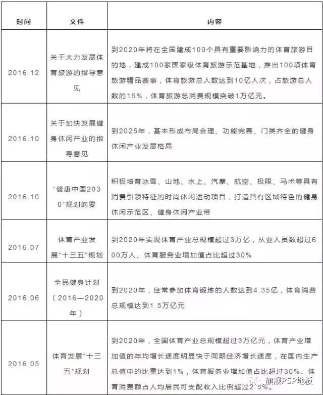 4、 新一輪改革發(fā)展階段(2013至今):深化改革為體育產(chǎn)業(yè)帶來紅利。2014年9月國務院常務會議上體育產(chǎn)業(yè)開始被定位為拉動內(nèi)需和經(jīng)濟轉(zhuǎn)型升級的“特殊”產(chǎn)業(yè)。2014年10月國務院提出到2025 年打造出5 萬億規(guī)模的體育市場。十三五期間將實現(xiàn)體育產(chǎn)業(yè)總規(guī)模超過3萬億,產(chǎn)業(yè)增加值在國內(nèi)生產(chǎn)總值中的比重達1.0%。