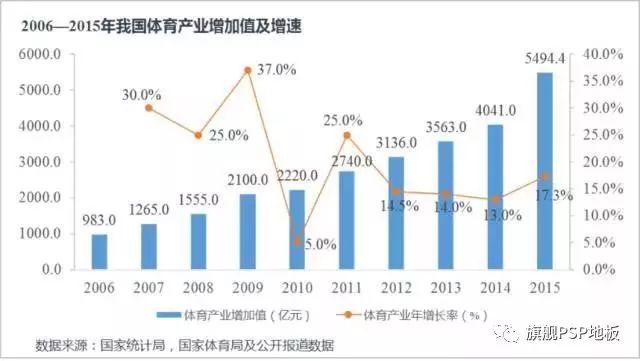 近十年來,我國體育產(chǎn)業(yè)增加值從2006年的983億增長至2015年的5494.4億,平均每年增速為21.1%,且持續(xù)增長態(tài)勢明顯。