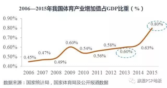 國家體育總局和統(tǒng)計局聯(lián)合發(fā)布的公告顯示,2015年國家體育產(chǎn)業(yè)總產(chǎn)出(總規(guī)模)為1.7萬億元,增加值為5494億元,占同期國內(nèi)生產(chǎn)總值的比重為0.8%。